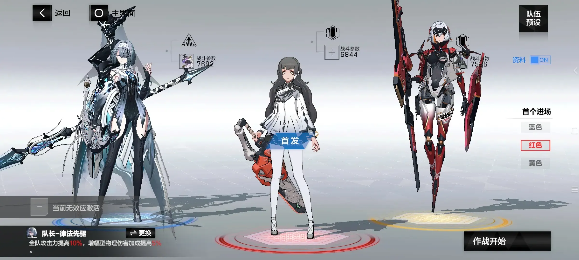 ④开荒物理队(凛冽单c):亚里莎·回音(蓝位,队长),七实·风暴(红位,首发),罗塞塔·凛冽(黄位)