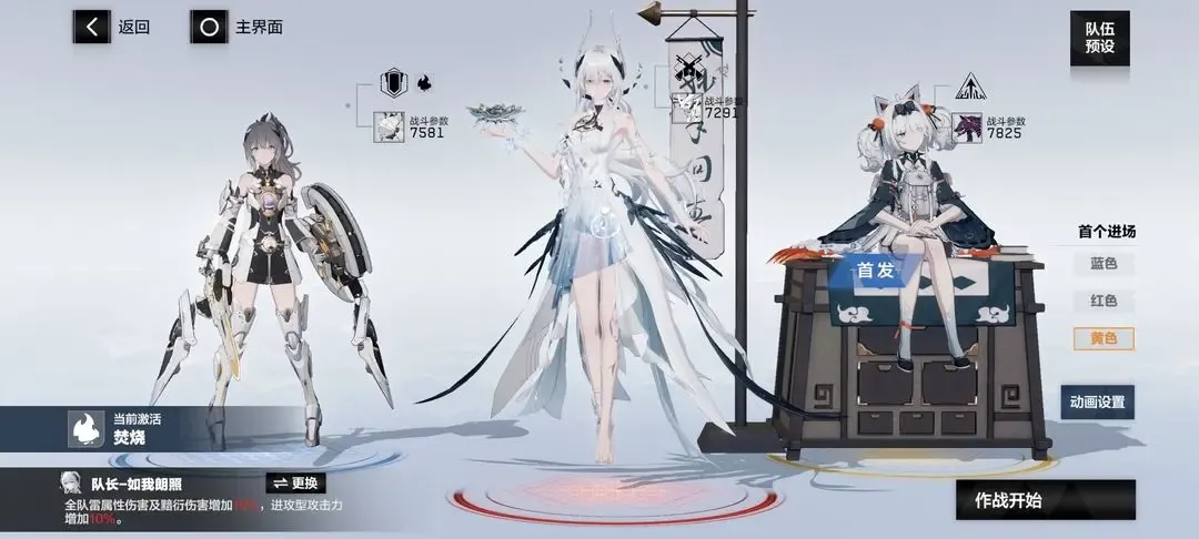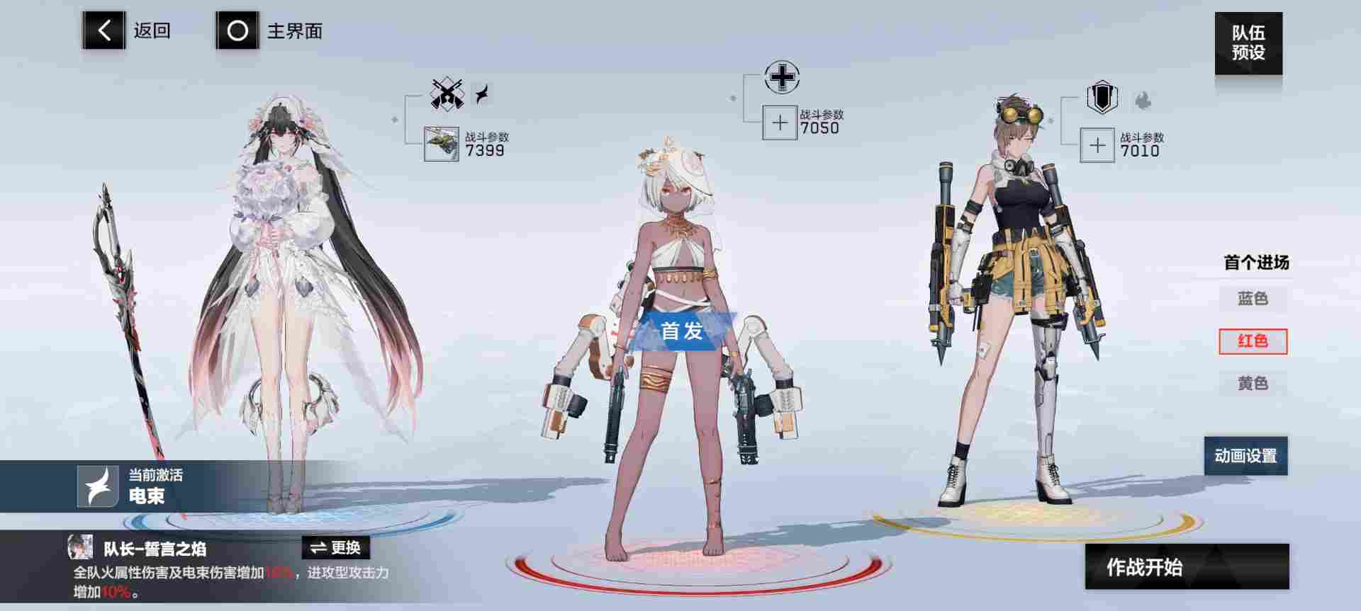 ②电束:七实·芒星之迹(蓝位,首发),露西亚·誓焰(红位,队长,输出),莉莉丝·谬影(黄位,启动),