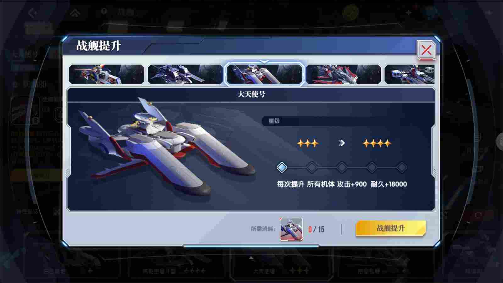 战舰可以通过消耗同类的战舰碎片进行升星,升星可以为全体机体带来攻击和耐久的提升,同时战舰每次完成升星(每升星5次)即可提升技能等级,提升技能的效果。