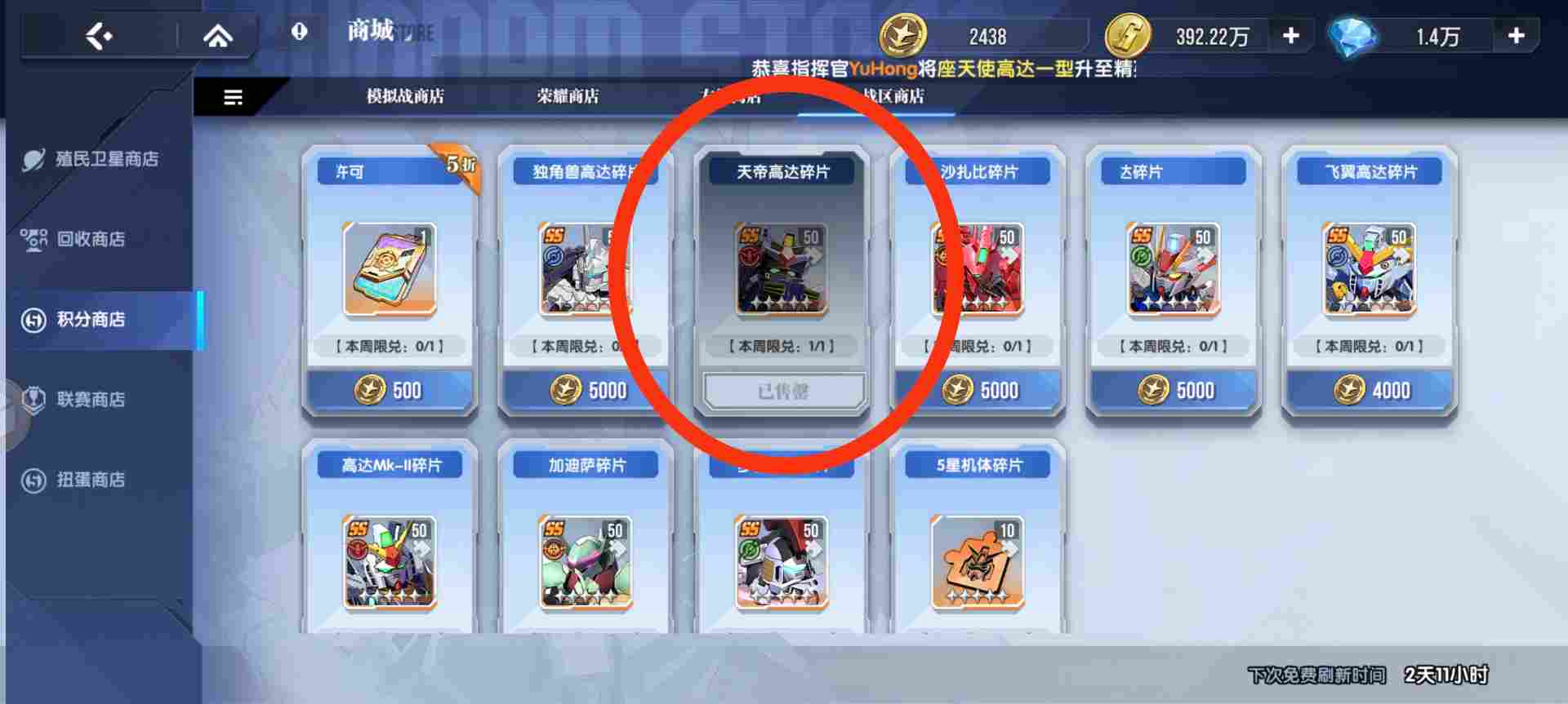 首页自选升星拿最高星的天帝高达放进去拿材料(自选天帝,战区商店5000一个,刚好新的一周又买一个。凑了3个天帝总算把战力拉到300W了!)