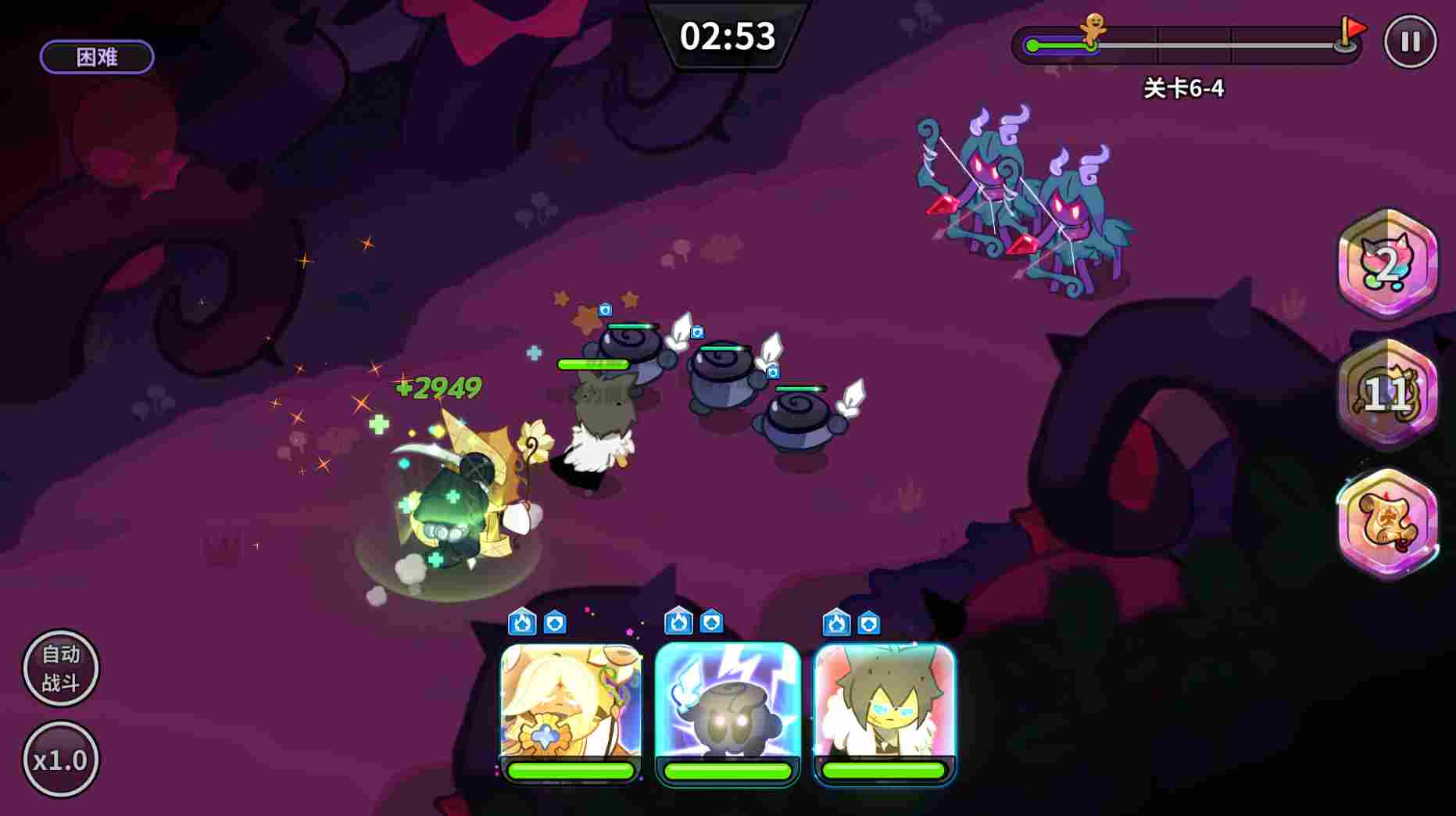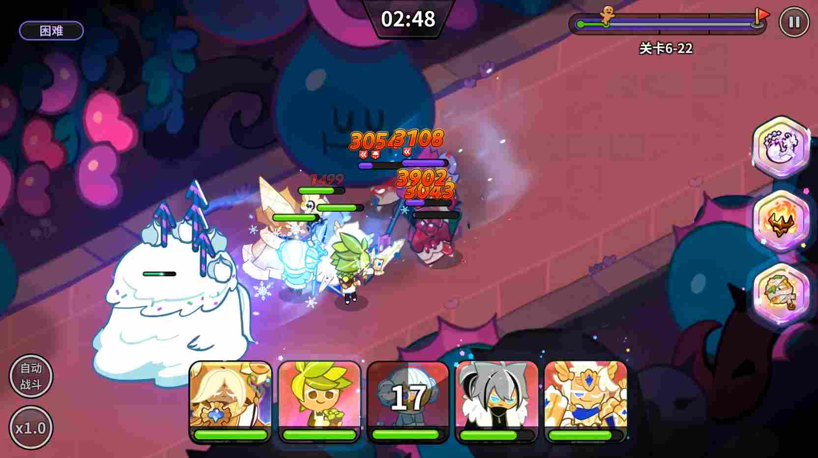粉雪饼干饼干是一个能召唤出召唤兽打伤害,同时能对敌人造成攻速降低效果的饼干。减攻速这个效果比较适合推图使用,PVP效果没那么明显。而且,如下图所示,可以看出来召唤的雪王是直接出现在全队的后排提供持续的输出,对前排坦度没改变也是不推荐他PVP的原因。