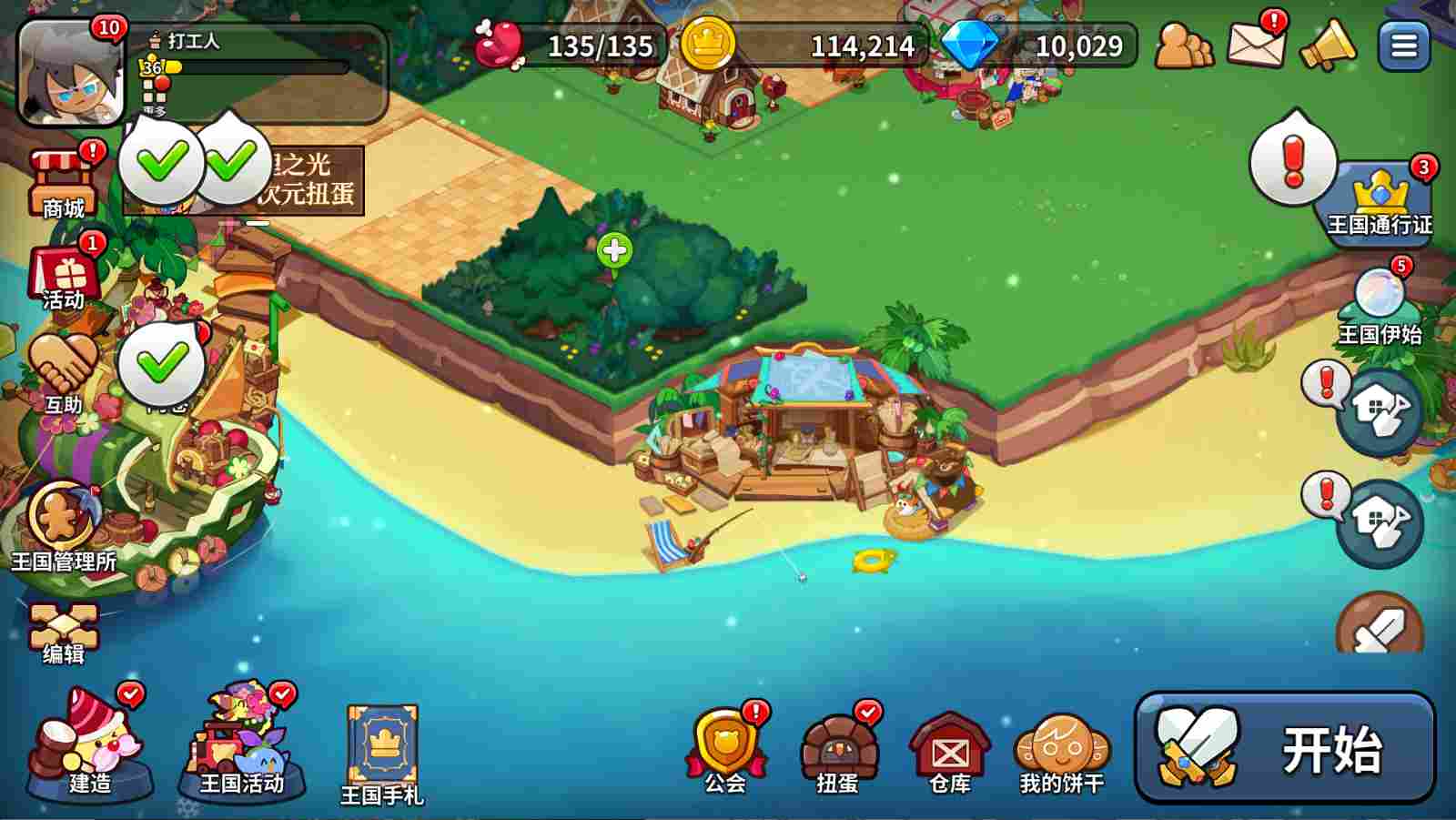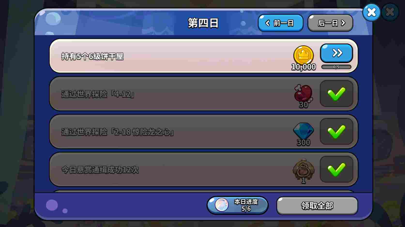 记得完成第四天的玉露芥子莲任务,但有一项需要持有“5个6级饼干屋”,注意一下,合成的饼干屋升6级算2个6级。当天主要升级的就是饼干屋等级。